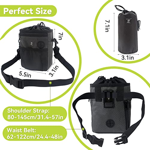 5 Bigger Compartments — ① The main pocket with drawstring closing have enough space to hold plenty of treats. ② Front zipper pocket is for holding the phone (Max for iPhone12promax), keys, money, coins. ③ Back zipper pocket can be a dog poop bag dispenser for waste bags. ④ The dog water bowl holder is perfect for holding the bottle up to 750ml / 25oz you need to stay dogs hydratedcan. ⑤ The front mesh pocket for quick and easy access to all your supplies.