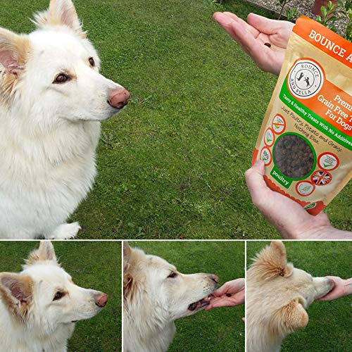 HEALTHY! Unlike other training treats which stuff their reward treats with cheap grains, our treats are grain, wheat and gluten free. Dogs are incapable of fully digesting grains so grain-free treats help with digestion, give them a shinier coat, more energy, less weight-gain, less shedding, better breath, healthier skin and means fewer trips to the vet and a happier and healthier dog.