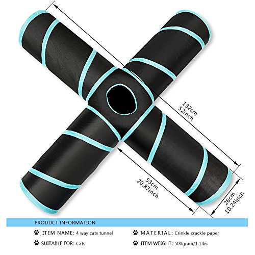 Pet toy tunnel,Upgrade verison of 3 way cat tunnel ,4 tubes with 10″ diameter and 52″ long(refer to picture),1 pop up peephole,and two balls.Spacious space can hold multiple or larger cats to have interactive game,exercise muscles and develop cat’s IQ