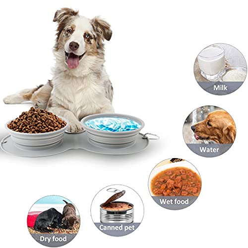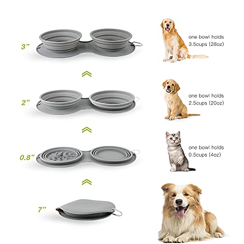 【Collapsible Dog Bowls】Double bowls design works as a full meal with food and water or feeding 2 pet friends at the same time. The collapsible dog bowl is 19 inches wide, 3 inches in height. Every single bowl can hold up to 35 oz or 4.5 cups of food or water at full height; 24.6 oz or 3.5 cups at half-height; 8 oz or 1 cup at compact height.