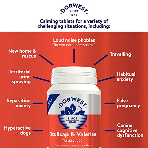 CALMING TABLETS FOR DOGS AND CATS: reduce your pet’s stress or anxiety with Dorwest Scullcap & Valerian Tablets for dogs and cats, specially formulated to relieve anxiety naturally so they can feel more alert, focused and calm again