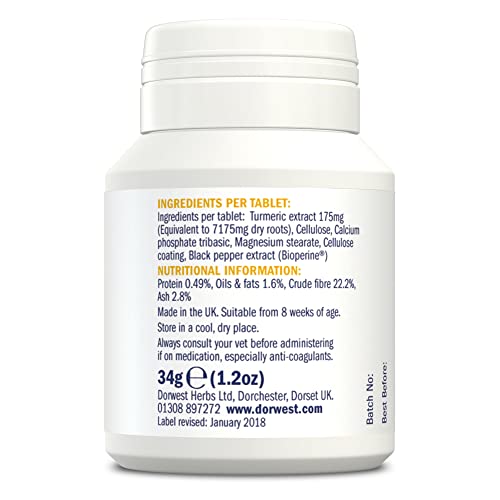 TURMERIC SUPPLEMENT FOR DOGS & CATS: Dorwest Turmeric Tablets for dogs and cats are specially formulated with a pure and potent extract to help support your pet’s natural anti-inflammatory processes, ideal for pets with troublesome joints