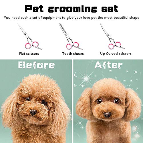 6pcs pet grooming set: 1 x straight cutting scissor, 1 x thinning scissor, 1 x curved scissor point up , 1 x curved scissor point down , 1 x grooming comb, 1 x scissor case.