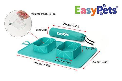 ? IDEAL FOR WALKS AND CAMPING ? If you camp with dogs then the Roll ?N? Go will be your saviour. It is the new ?Must Have? doggie accessory. Easy to pack and super quick to roll out and use. EasyPets Mat Rolls away in seconds and conveniently pops back in to its carry case. This means wherever you go you have a suitable, clean, handy double bowl set for water and feeding.