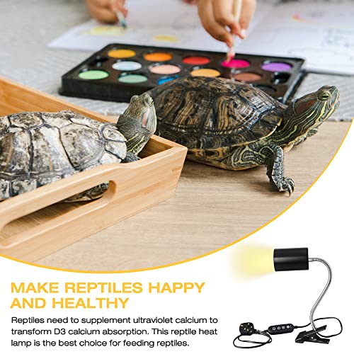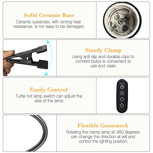 【Flexible Gooseneck & Clamp Design】 360° rotation angle reptile heat lamp with 28cm gooseneck which easy to adjust the lamp head distance to meet the needs of reptiles at different times. This reptile heat lamp also comes with a strong clamp, which is simple to install and convenient to clip the E27 basking lamp on table or other edge of pet house.