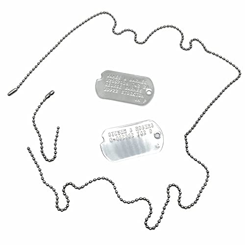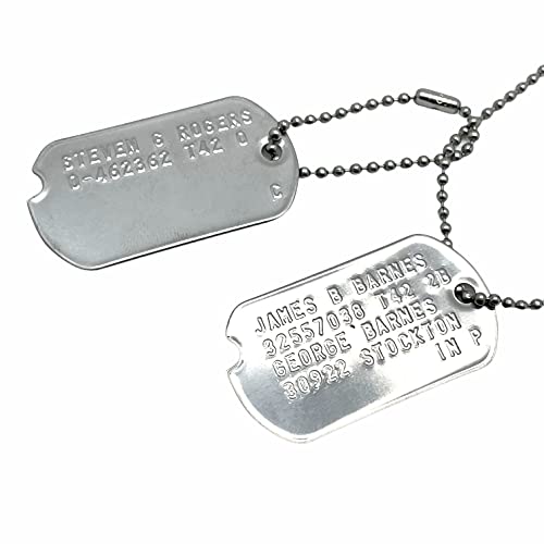 ‘Bucky’ x ‘Captain America’ Movie Accurate Inspired US military spec WW2 dog tag set. 2 X 304 grade stainless steel rolled edge WW2 replica dog tags, 1 X 76cm & 1 X 10cm 304 grade stainless steel chains