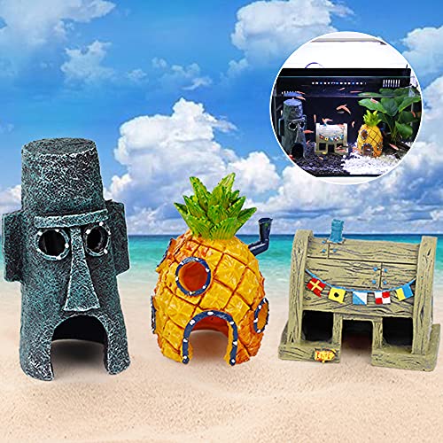 【Perfect Decoration Size】- The pineapple house’s size is 3*2.8*5.1in, squidward hideout’s size is 2.8*2.4*5.7in, krusty krab’s size is 3.5*2.2*3.3in, they are designed to be the perfect accent to many aquarium.