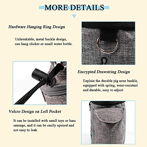 🐕Dog Training Bag Using: With big opening and drawstring closure allows quick access to pouch with one hand, freeing the other for training signals and commands. It can stay open for every time you need a treat. Keep all your training gear, waste bags and valuables in one place without the need to fumble and twist.The built-in poop bag dispenser is on the side for easy access.