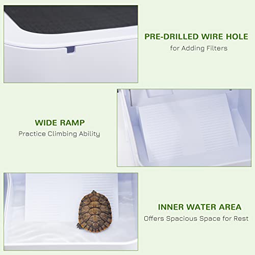 TWO ROOMS: A built-in water area and basking platform is the ideal habitat for turtles and tortoises. Comes with a two-hole tube for feeding and a wide ramp for exercise.