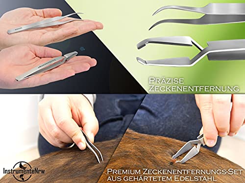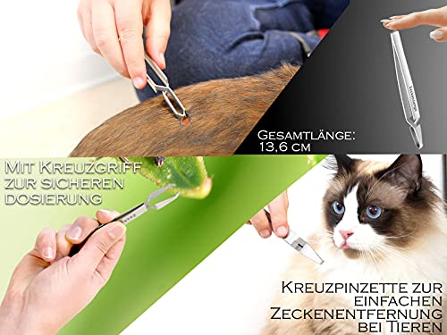 1 * Straight tick remover tweezers with cross mechanism. The total length is 13.6 cm, the tweezers head is 4 mm wide