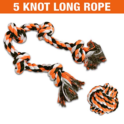 🐾 HIGHEST QUALITY 🐾 These rope toys are made from extra thick material, which is much stronger and more durable than similar items on the market. The rope is 36 inches (90cm) long with 5 knots and 2 pounds (900g) in total weight. The ball is 4 inches (10cm) in diameter and 0.45 pounds (200g) in total weight. Those bright colours make it even more awesome and attractive to your dog!