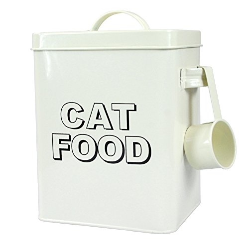 The cat food metal tin with durable enamel finish, measures 18cm x 15.5cm x 24.5cm high