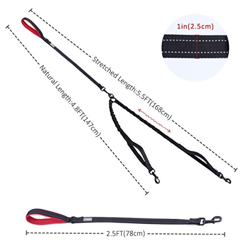 SHOCK-ABSORBING DESIGN: VIVAGLORY double dog lead is designed with high-quality bungee cord to drastically reduce pulling strain on you and your dog. The lead with bungee can be extended from 4.8FT to 5.5FT to give your two dogs much more freedom to explore
