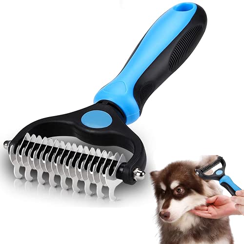 2 In 1 Pet Grooming Tool Dematting Comb for Dogs & Cats 2 Sided Undercoat Rake Deshedding Tool Cat Matted Fur Remover For Long Haired Cat Dog Tangles Removing (Blue)