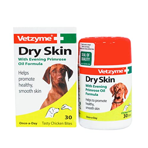 Vetzyme Dry Skin Tablets for Dogs (30 Tablets) – Dry and Itchy Skin Relief, Promotes Healthy and Smooth Skin, Tasty Chicken Flavour